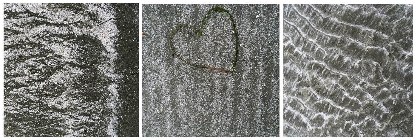Life may be more than a beach in Tofino, but the beaches are what people invariably fall in love with. My favourite is Chesterman Beach. I find something new on every walk there. On a foggy morning, with the chilly air pinching our faces and hands, we explored Chesterman Beach at low tide and in solitude, ahead of the day’s crowds. This day, we discover the most exquisite patterns of dried white and wet green algae. I likely spent an hour photographing a big patch on Frank Island. There were also beautiful sand textures, a variety of shells, sand dollars and even the remains of a car with only 4 tires slightly visible above the sand. As we both looked out to the grey horizon on the western edge of Canada, our thoughts turn to the possibility that this car crossed the great Pacific Ocean due to the last Japanese tsunami. We took a moment to be grateful for our wonderful life.