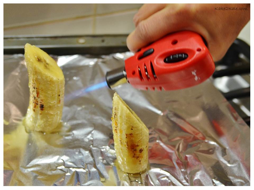 - Broil for about 5 minutes (keeping an eye on it), until sugar caramelizes. Or alternately use a mini torch to brulee the banana.
